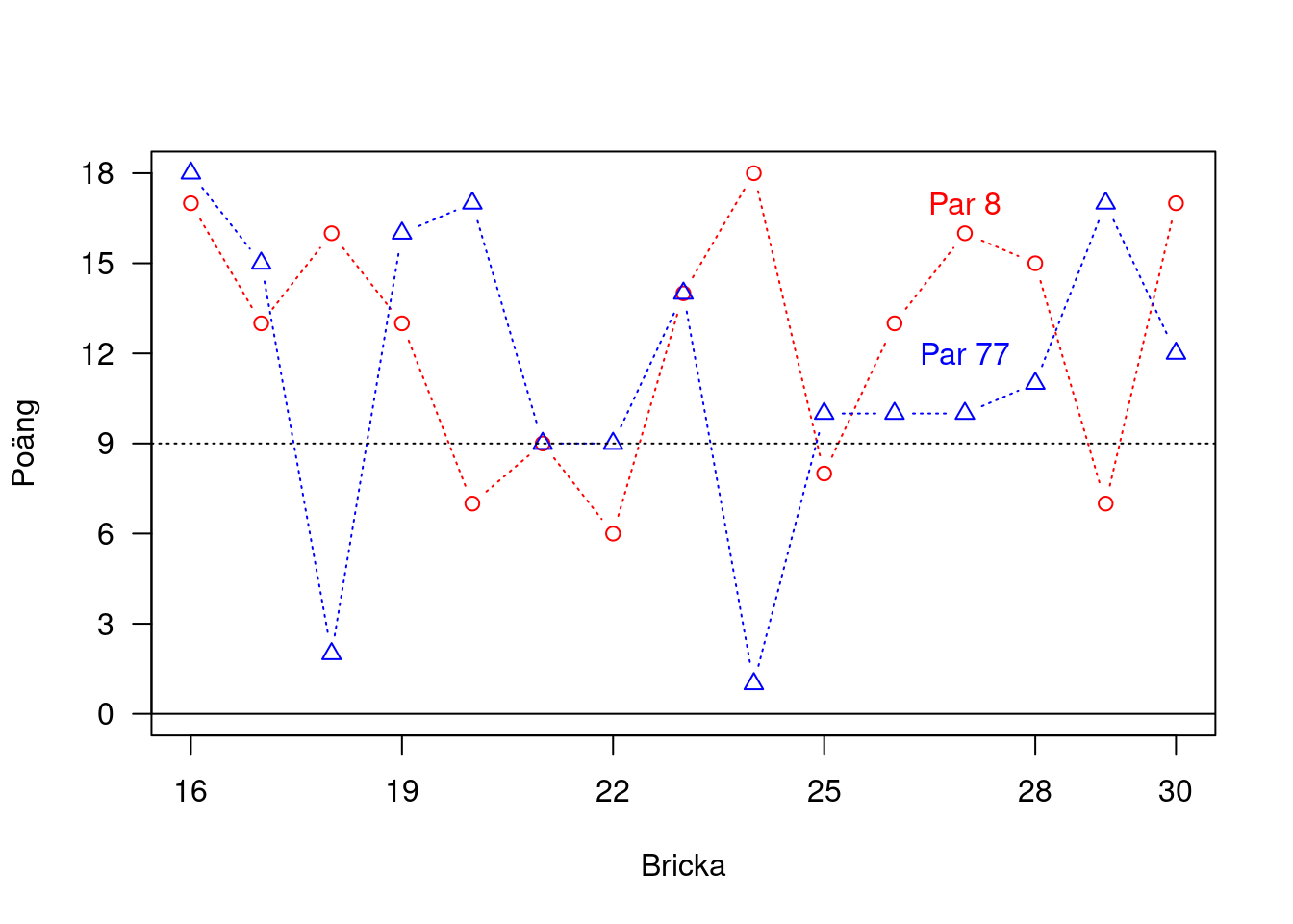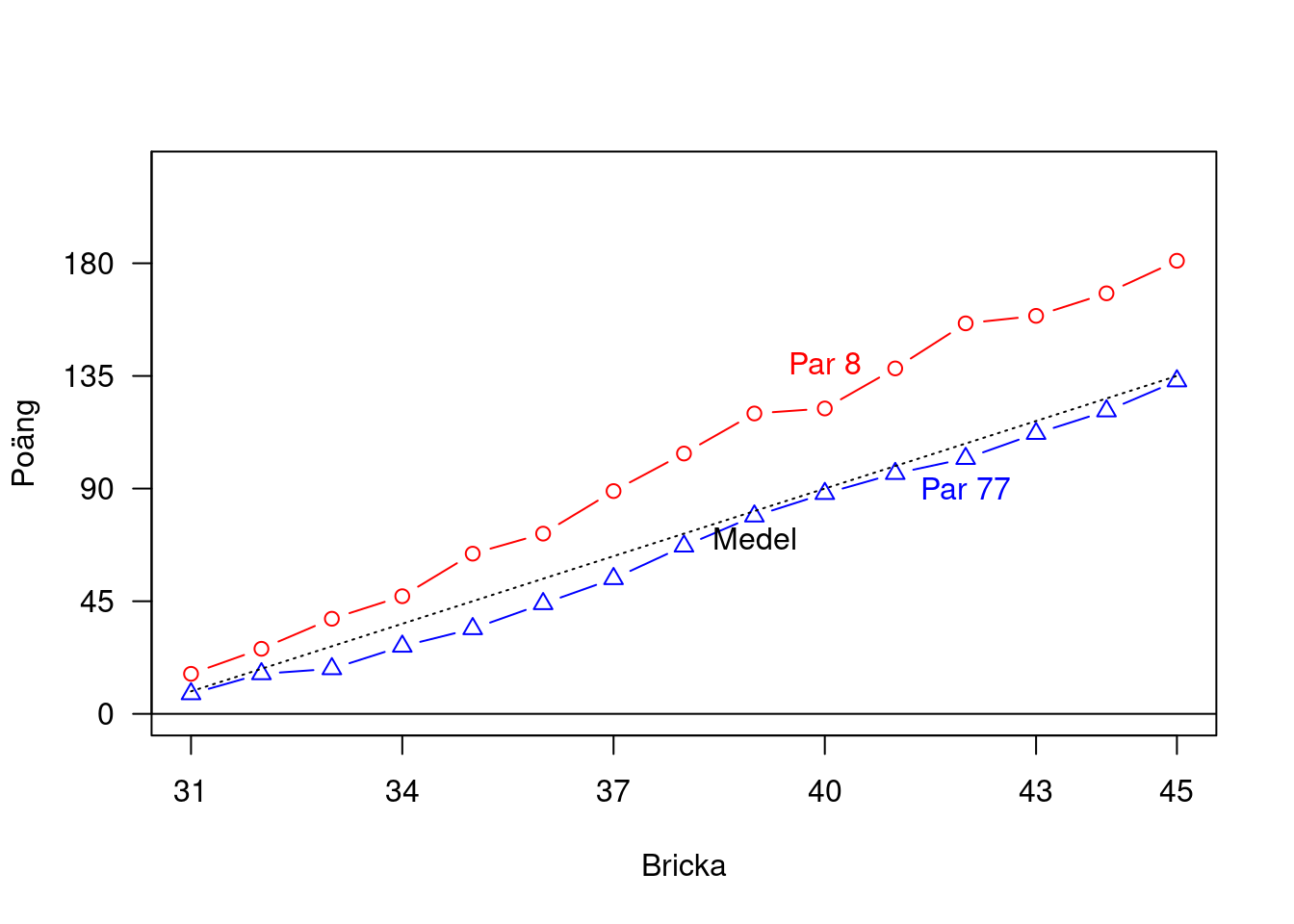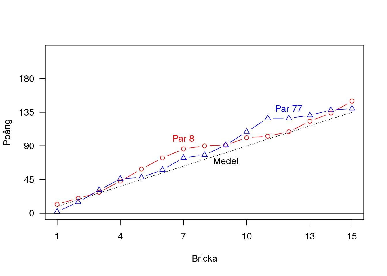Ur detta kan vi utläsa att par 8 tog i genomsnitt 11.6 poäng per bricka medan motsvarande siffra för par 77 är 9.9. Vi ser också att “p-value” är 0.1077, dvs ungefär 11 procent. Det betyder, enligt opinionsinstitutsjargong, att den observerade skillnaden ligger inom felmarginalen. Alltså, resultatet i den här tävlingen är inte ett bevis för att det är någon skillnad i spelstyrka mellan paren!